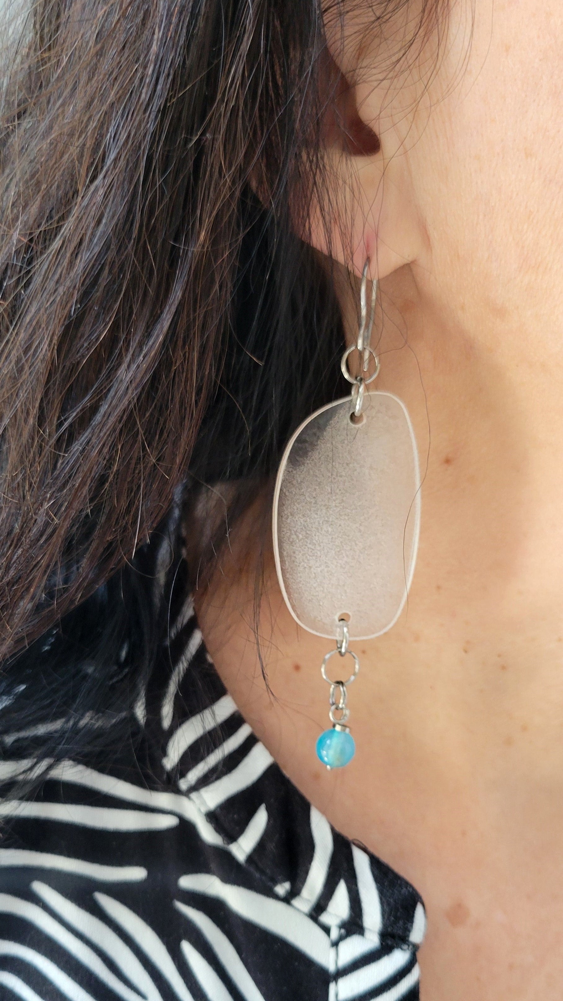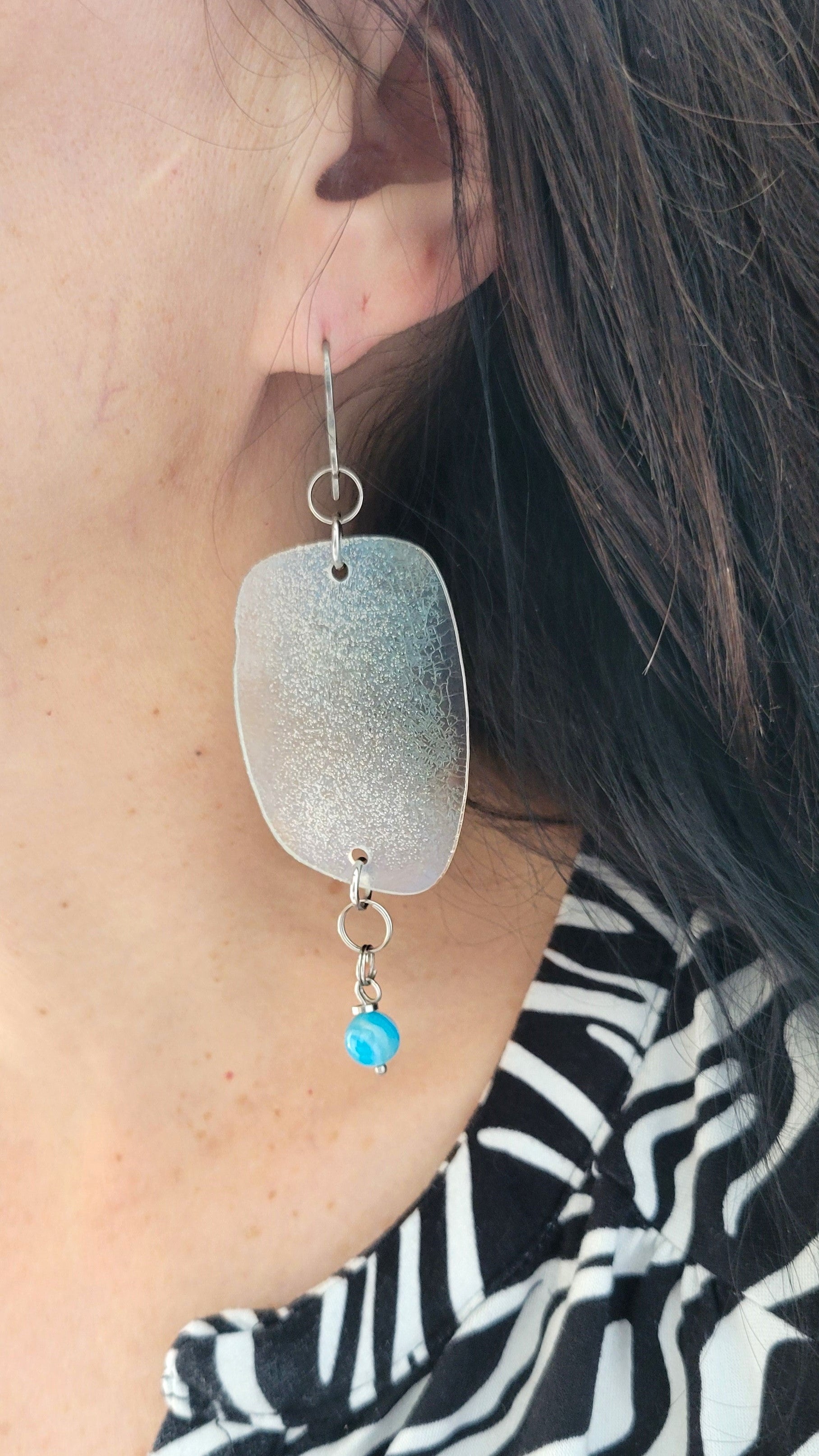 Dans mon atelier dans la région de Lanaudière à Joliette, je transforme chaque pièce à partir de lunettes de seconde main que je défais morceau par morceau. Les verres de lunettes plastifiés sont transformés à chaud pour augmenter la coloration de la matière. Les lunettes sont triées, nettoyées, façonnées, poncées et assemblées. Chaque pièce est légère et unique, et peut légèrement varier de la photo. Mes bijoux captent la lumière et changent de couleurs selon leur orientation. Les montures, les branches, les plaquettes, les manchons, les verres, les charnières sont métalliques ou plastifiées et recyclées. Les chaînes, tiges, crochets, dormeuses, breloques et apprêts sont en acier inoxydable et à l'état neuf ainsi que les pierres fines.