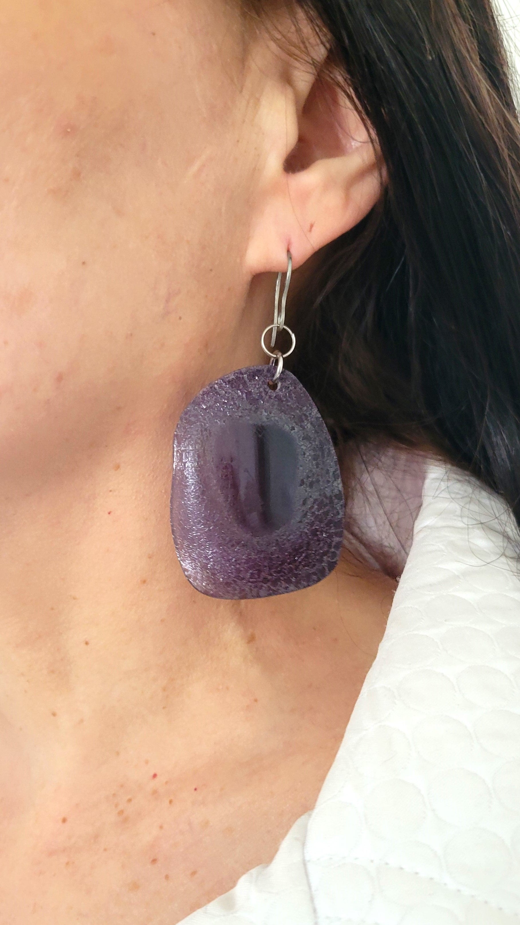 Dans mon atelier dans la région de Lanaudière à Joliette, je transforme chaque pièce à partir de lunettes de seconde main que je défais morceau par morceau. Les verres de lunettes plastifiés sont transformés à chaud pour augmenter la coloration de la matière. Les lunettes sont triées, nettoyées, façonnées, poncées et assemblées. Chaque pièce est légère et unique, et peut légèrement varier de la photo. Mes bijoux captent la lumière et changent de couleurs selon leur orientation. Les montures, les branches, les plaquettes, les manchons, les verres, les charnières sont métalliques ou plastifiées et recyclées. Les chaînes, tiges, crochets, dormeuses, breloques et apprêts sont en acier inoxydable et à l'état neuf ainsi que les pierres fines.