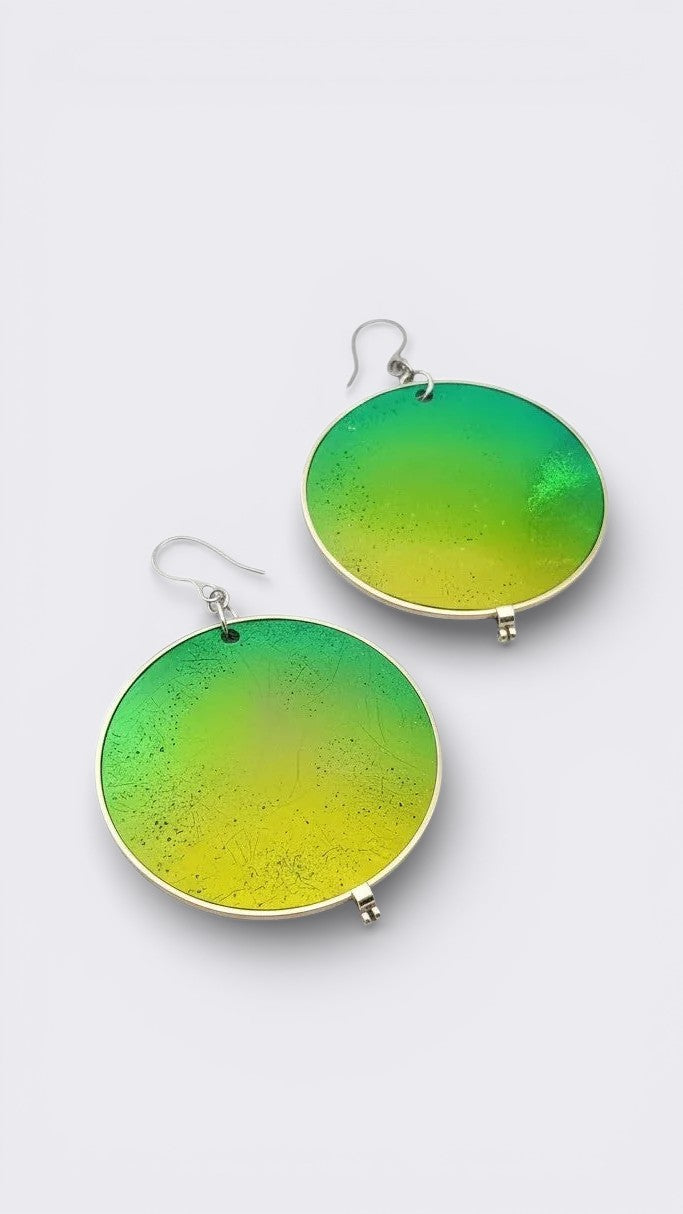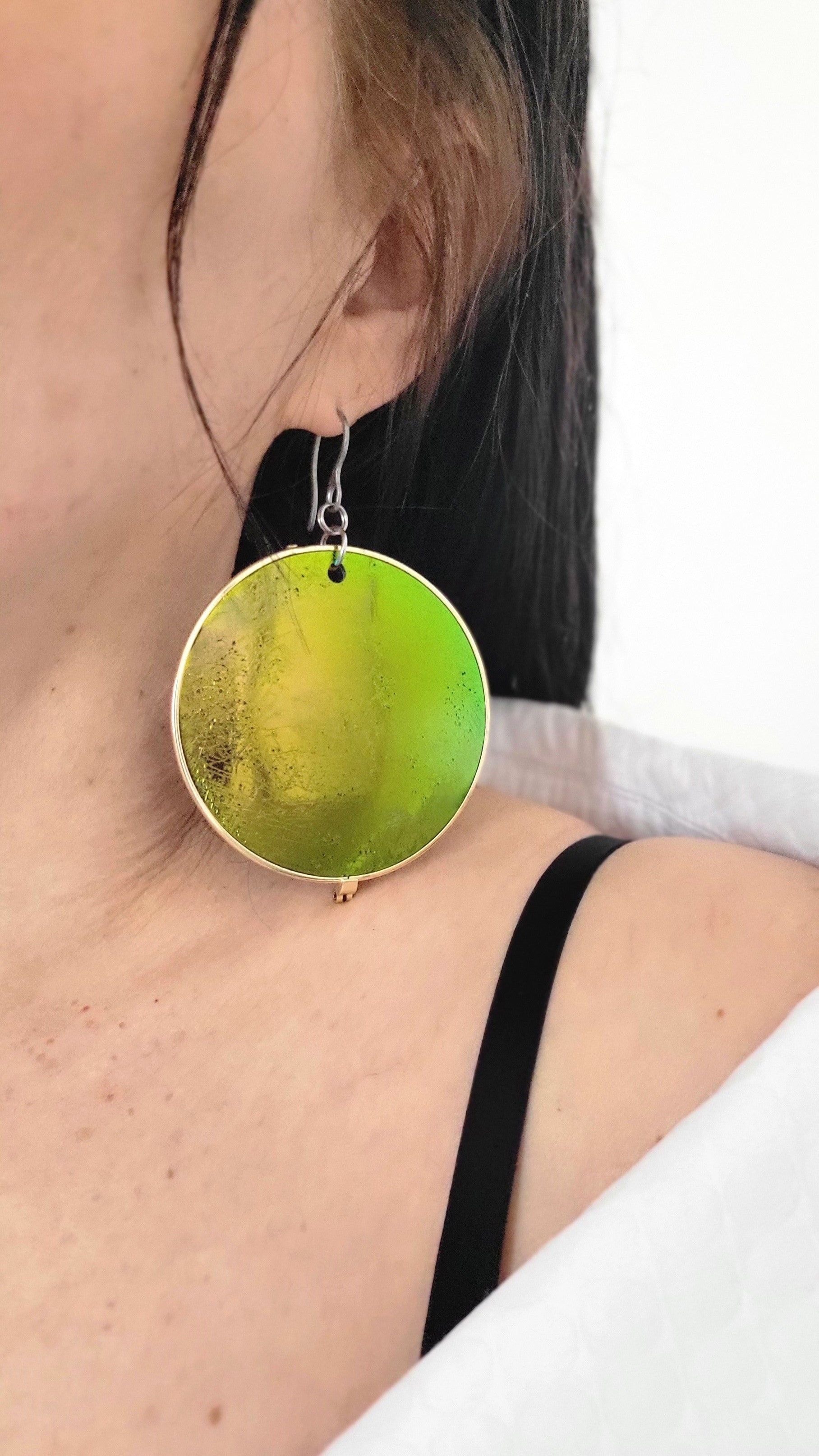 Dans mon atelier dans la région de Lanaudière à Joliette, je transforme chaque pièce à partir de lunettes de seconde main que je défais morceau par morceau. Les verres de lunettes plastifiés sont transformés à chaud pour augmenter la coloration de la matière. Les lunettes sont triées, nettoyées, façonnées, poncées et assemblées. Chaque pièce est légère et unique, et peut légèrement varier de la photo. Mes bijoux captent la lumière et changent de couleurs selon leur orientation. Les montures, les branches, les plaquettes, les manchons, les verres, les charnières sont métalliques ou plastifiées et recyclées. Les chaînes, tiges, crochets, dormeuses, breloques et apprêts sont en acier inoxydable et à l'état neuf ainsi que les pierres fines.