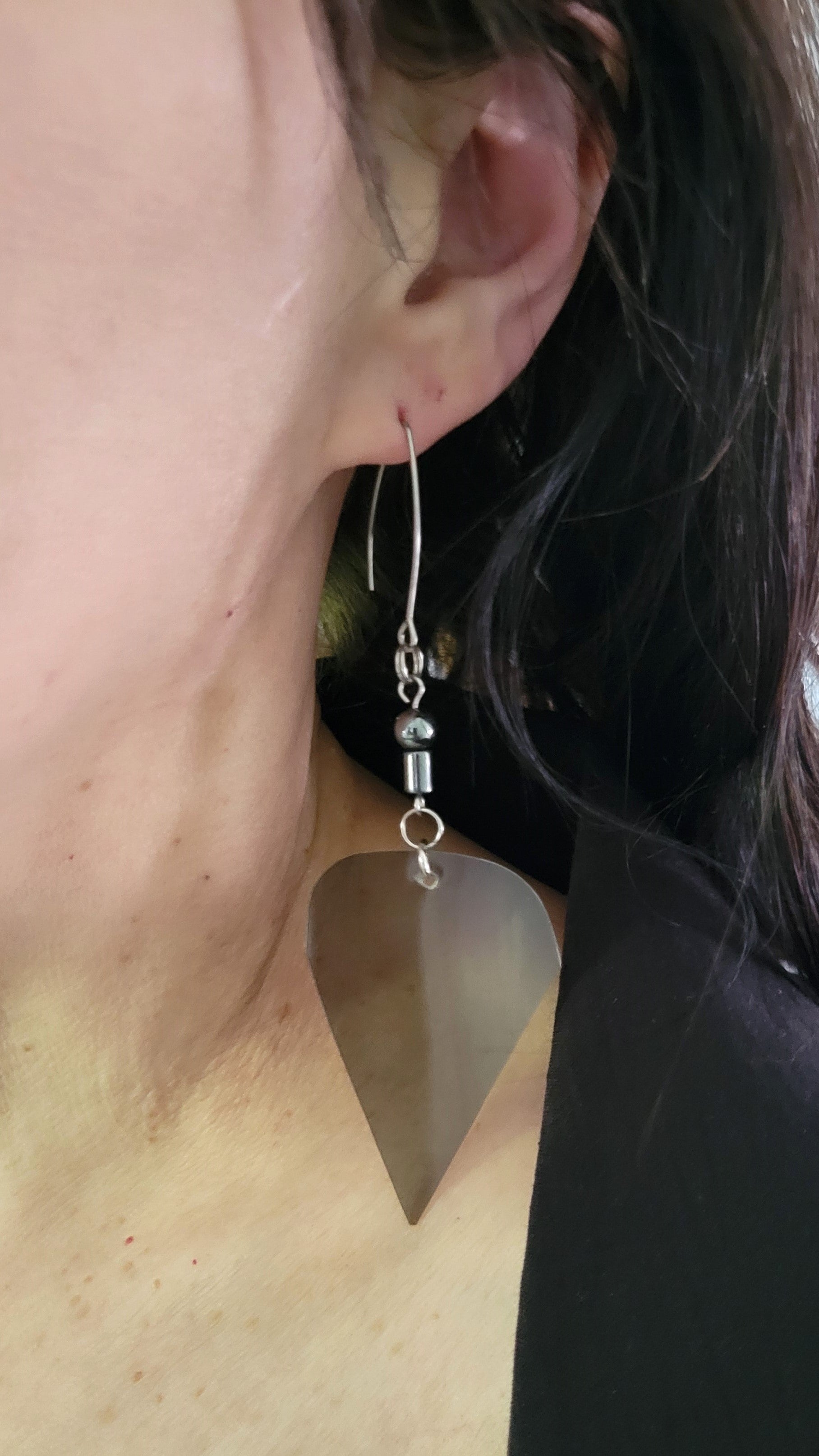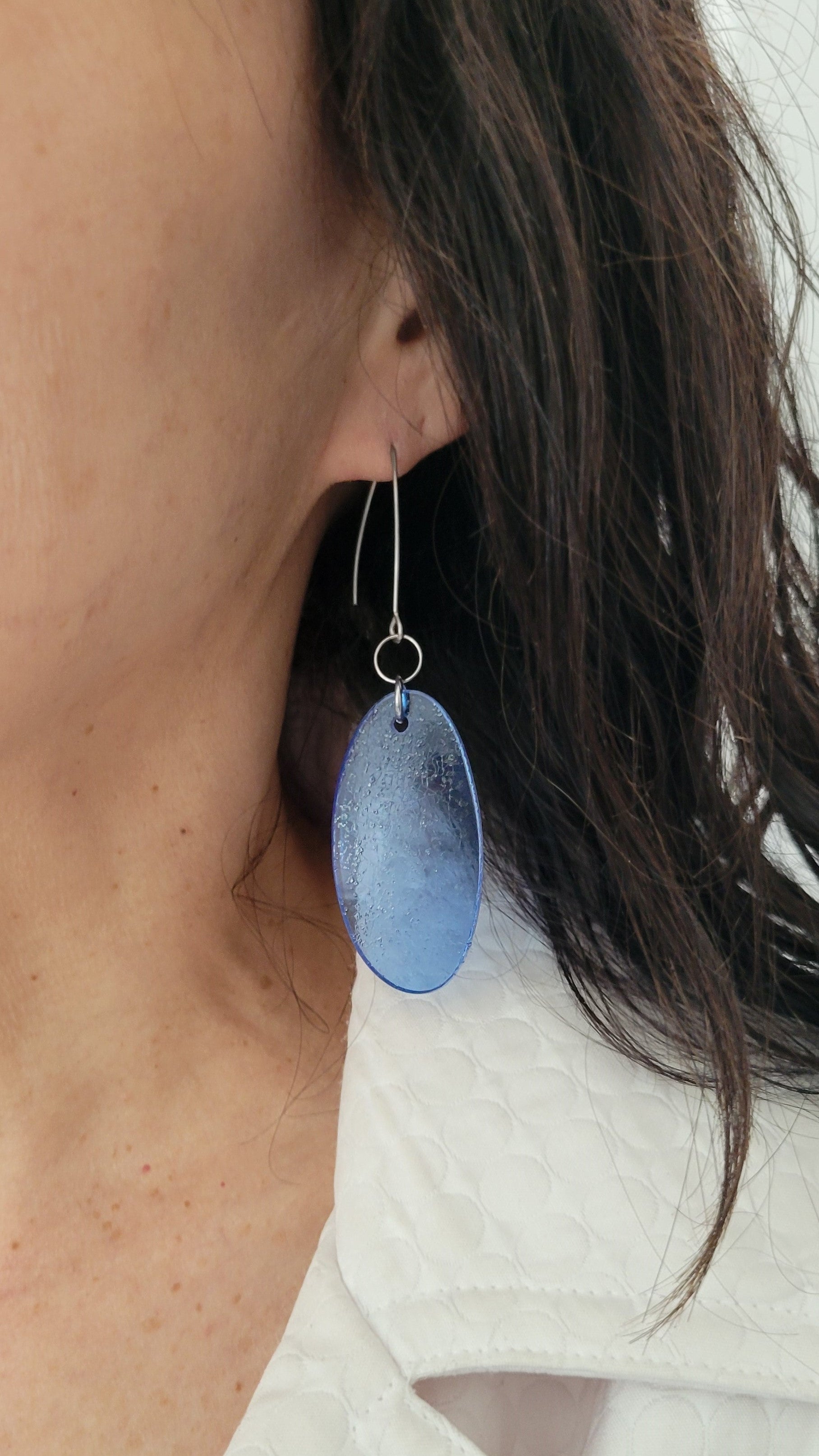 Dans mon atelier dans la région de Lanaudière à Joliette, je transforme chaque pièce à partir de lunettes de seconde main que je défais morceau par morceau. Les verres de lunettes plastifiés sont transformés à chaud pour augmenter la coloration de la matière. Les lunettes sont triées, nettoyées, façonnées, poncées et assemblées. Chaque pièce est légère et unique, et peut légèrement varier de la photo. Mes bijoux captent la lumière et changent de couleurs selon leur orientation. Les montures, les branches, les plaquettes, les manchons, les verres, les charnières sont métalliques ou plastifiées et recyclées. Les chaînes, tiges, crochets, dormeuses, breloques et apprêts sont en acier inoxydable et à l'état neuf ainsi que les pierres fines.