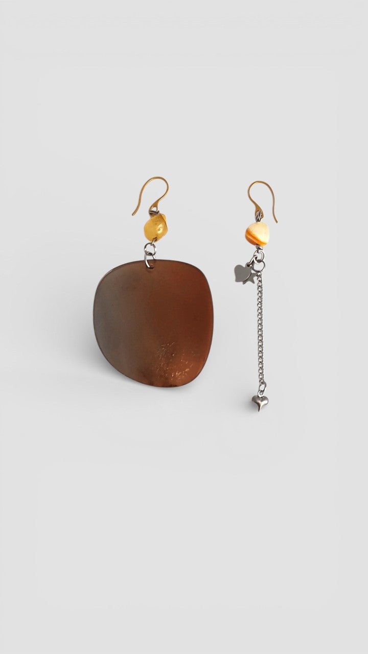 Dans mon atelier dans la région de Lanaudière à Joliette, je transforme chaque pièce à partir de lunettes de seconde main que je défais morceau par morceau. Les verres de lunettes plastifiés sont transformés à chaud pour augmenter la coloration de la matière. Les lunettes sont triées, nettoyées, façonnées, poncées et assemblées. Chaque pièce est légère et unique, et peut légèrement varier de la photo. Mes bijoux captent la lumière et changent de couleurs selon leur orientation. Les montures, les branches, les plaquettes, les manchons, les verres, les charnières sont métalliques ou plastifiées et recyclées. Les chaînes, tiges, crochets, dormeuses, breloques et apprêts sont en acier inoxydable et à l'état neuf ainsi que les pierres fines.